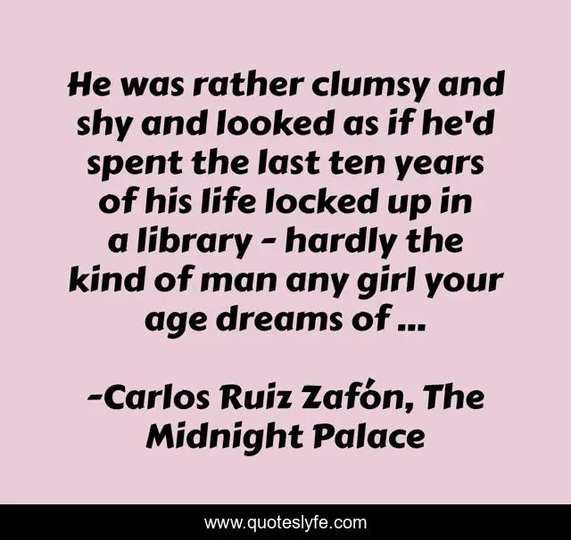 This page presents the quote "He was rather clumsy and shy and looked as if he'd spent the last ten years of his life locked up in a library - hardly the kind of man any girl your age dreams of ...". Author of this quote is Carlos Ruiz Zafón, The Midnight Palace. This quote is about clumsy, dreams, library, shy,.