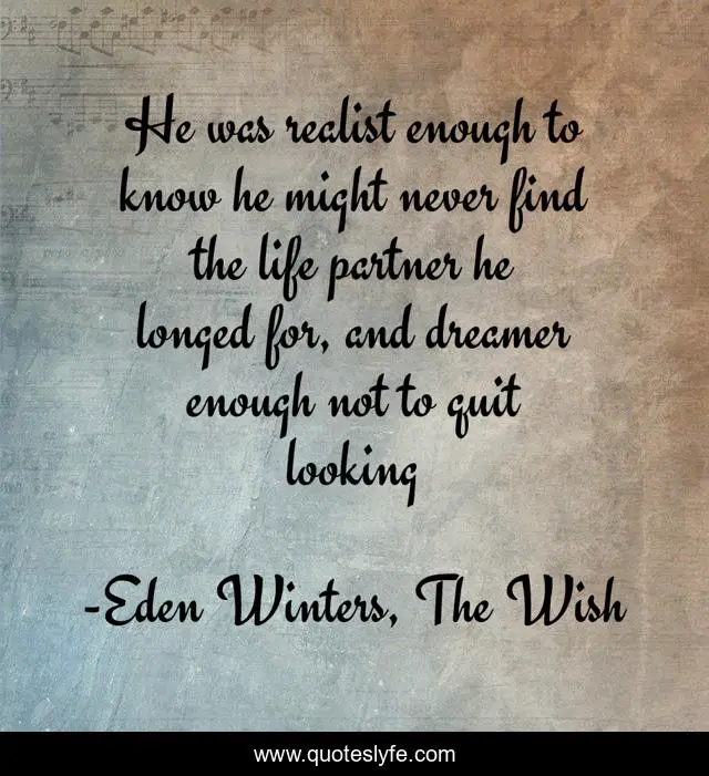 This page presents the quote "He was realist enough to know he might never find the life partner he longed for, and dreamer enough not to quit looking". Author of this quote is Eden Winters, The Wish. This quote is about inspirational-attitude, love, affection,.