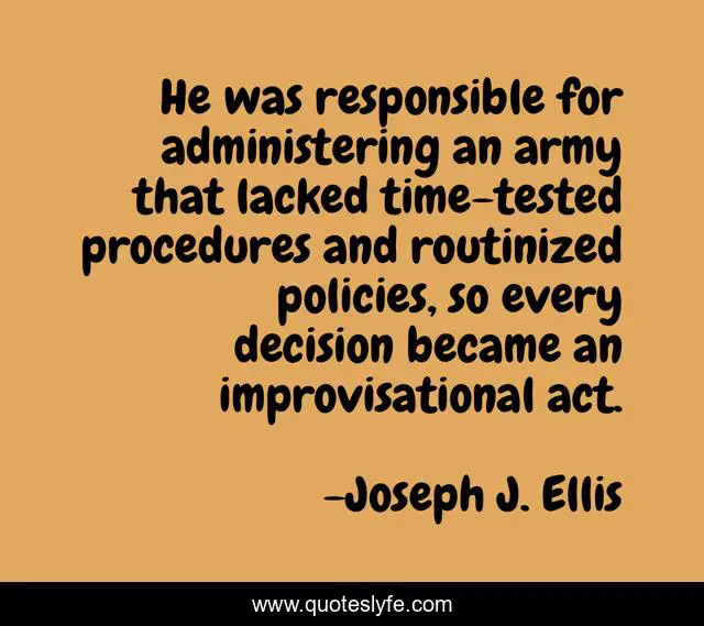 This page presents the quote "He was responsible for administering an army that lacked time-tested procedures and routinized policies, so every decision became an improvisational act.". Author of this quote is Joseph J. Ellis. This quote is about rules, planning, procedures, policies, leadership,.