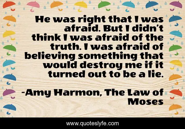 This page presents the quote "He was right that I was afraid. But I didn’t think I was afraid of the truth. I was afraid of believing something that would destroy me if it turned out to be a lie.". Author of this quote is Amy Harmon, The Law of Moses. This quote is about lies, amy-harmon, the-law-of-moses, quotes, believing,.