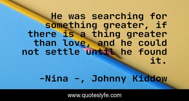 This page presents the quote "He was searching for something greater, if there is a thing greater than love, and he could not settle until he found it.". Author of this quote is Nina -, Johnny Kiddow. This quote is about love, searching, happiness, greatness, finding, affection,.