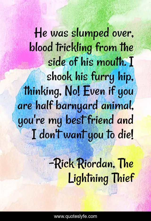 This page presents the quote "He was slumped over, blood trickling from the side of his mouth. I shook his furry hip, thinking, No! Even if you are half barnyard animal, you're my best friend and I don't want you to die!". Author of this quote is Rick Riordan, The Lightning Thief. This quote is about percy-jackson, grover-underwood,.