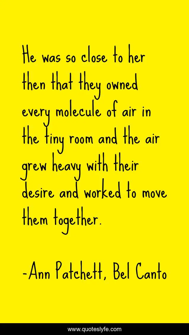 This page presents the quote "He was so close to her then that they owned every molecule of air in the tiny room and the air grew heavy with their desire and worked to move them together.". Author of this quote is Ann Patchett, Bel Canto. This quote is about desire, closeness, love, affection,.