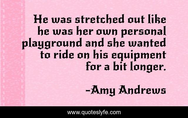 This page presents the quote "He was stretched out like he was her own personal playground and she wanted to ride on his equipment for a bit longer.". Author of this quote is Amy Andrews. This quote is about humor, amy-andrews, brazen, romance, quotes, hot-rugby-dudes, playing-the-player, rugby, sydney-smoke-rugby-series,.