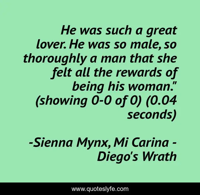 This page presents the quote "He was such a great lover. He was so male, so thoroughly a man that she felt all the rewards of being his woman." (showing 0-0 of 0) (0.04 seconds)". Author of this quote is Sienna Mynx, Mi Carina - Diego's Wrath. This quote is about romance, interracial, lovers, passion,.