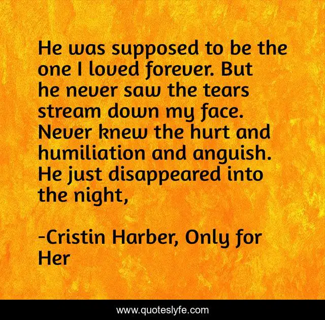 This page presents the quote "He was supposed to be the one I loved forever. But he never saw the tears stream down my face. Never knew the hurt and humiliation and anguish. He just disappeared into the night, ". Author of this quote is Cristin Harber, Only for Her. This quote is about romance-novel, romantic, new-adult-contemporary-romance, hurt-feelings, new-adult, feels, sweet-romance,.