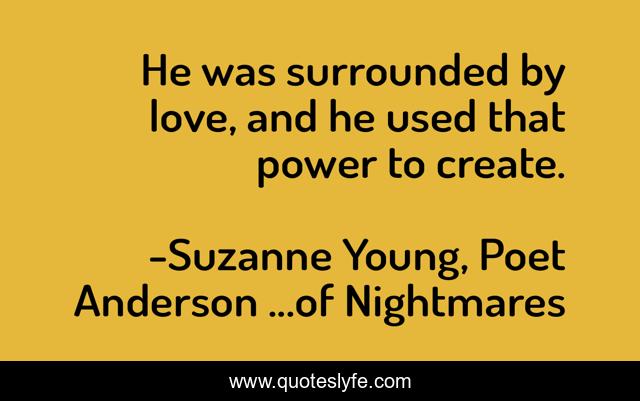 This page presents the quote "He was surrounded by love, and he used that power to create.". Author of this quote is Suzanne Young, Poet Anderson ...of Nightmares. This quote is about love, creation, creativity, tom-delonge, inspirational, enthusiasm, affection,.