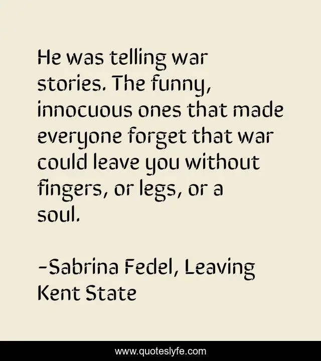 This page presents the quote "He was telling war stories. The funny, innocuous ones that made everyone forget that war could leave you without fingers, or legs, or a soul.". Author of this quote is Sabrina Fedel, Leaving Kent State. This quote is about sabrian-fedel, kent-state, young-adult, vietnam-war,.