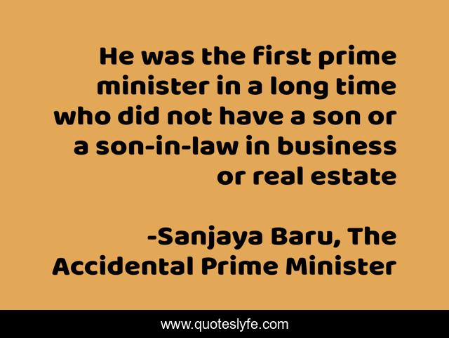 This page presents the quote "He was the first prime minister in a long time who did not have a son or a son-in-law in business or real estate". Author of this quote is Sanjaya Baru, The Accidental Prime Minister. This quote is about baru, leadership, india, manmohan-sngh, politics,.
