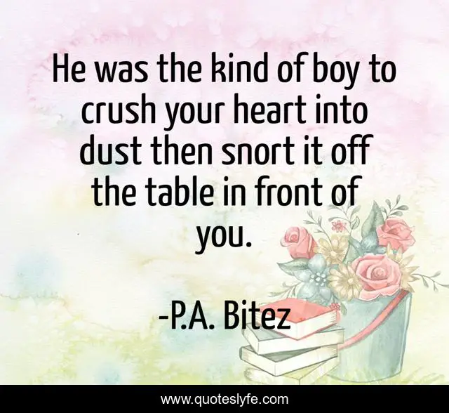 This page presents the quote "He was the kind of boy to crush your heart into dust then snort it off the table in front of you.". Author of this quote is P.A. Bitez. This quote is about addiction, heartbreak, love, affection,.