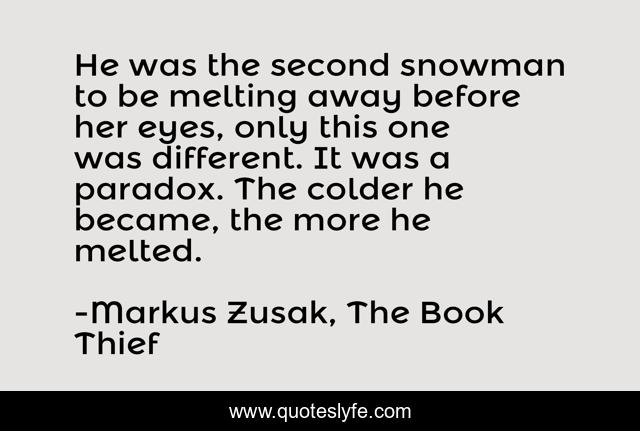 This page presents the quote "He was the second snowman to be melting away before her eyes, only this one was different. It was a paradox. The colder he became, the more he melted.". Author of this quote is Markus Zusak, The Book Thief. This quote is about snowman, melting, paradox, sad,.