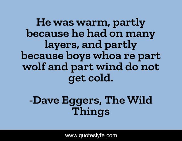 This page presents the quote "He was warm, partly because he had on many layers, and partly because boys whoa re part wolf and part wind do not get cold.". Author of this quote is Dave Eggers, The Wild Things. This quote is about cute, comedy, funny, happiness, smile,.