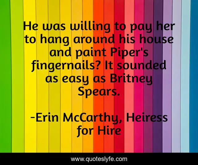 This page presents the quote "He was willing to pay her to hang around his house and paint Piper's fingernails? It sounded as easy as Britney Spears.". Author of this quote is Erin McCarthy, Heiress for Hire. This quote is about britney-spears, job, easy, babysitting,.