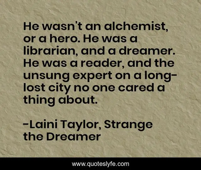 This page presents the quote "He wasn't an alchemist, or a hero. He was a librarian, and a dreamer. He was a reader, and the unsung expert on a long-lost city no one cared a thing about.". Author of this quote is Laini Taylor, Strange the Dreamer. This quote is about dreamer, librarian, books, dreaming,.