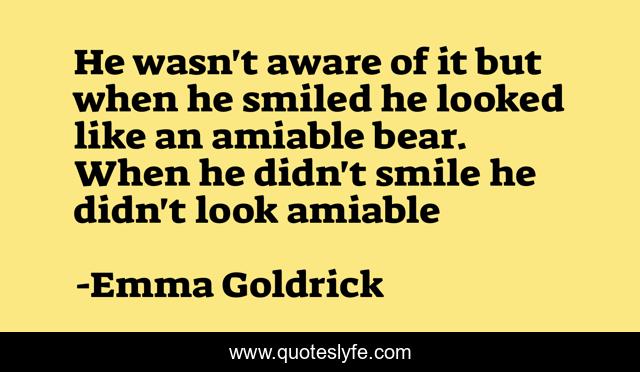 This page presents the quote "He wasn't aware of it but when he smiled he looked like an amiable bear. When he didn't smile he didn't look amiable". Author of this quote is Emma Goldrick. This quote is about funny, humor, harlequin-special-edition, witty, romance, emma, wit, hero, goldrick,.