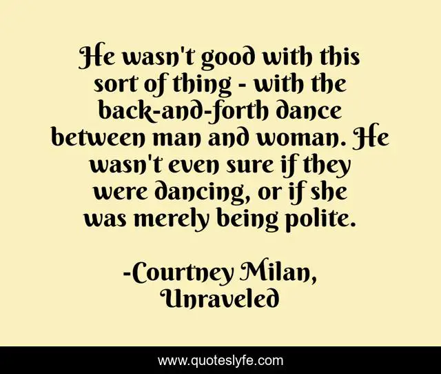 This page presents the quote "He wasn't good with this sort of thing - with the back-and-forth dance between man and woman. He wasn't even sure if they were dancing, or if she was merely being polite.". Author of this quote is Courtney Milan, Unraveled. This quote is about seduction, love, relationship, dancing, dance, flirting, polite, back-and-forth, affection,.