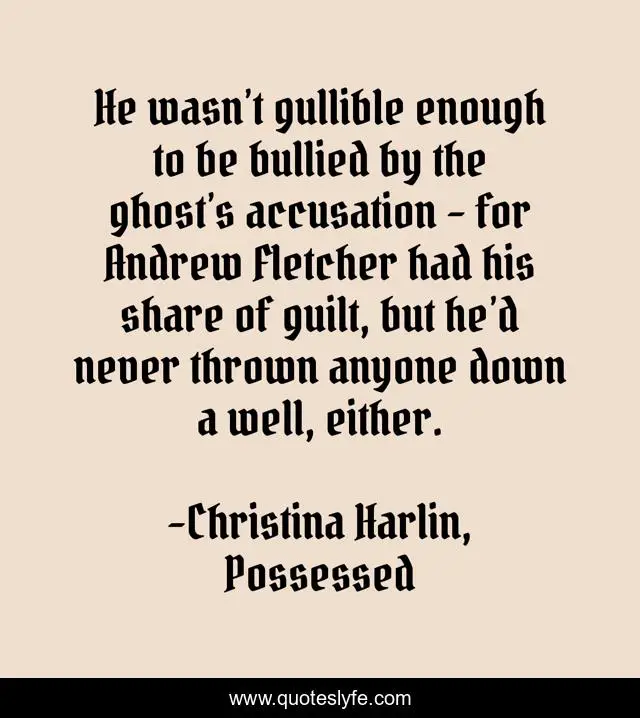 This page presents the quote "He wasn’t gullible enough to be bullied by the ghost’s accusation – for Andrew Fletcher had his share of guilt, but he’d never thrown anyone down a well, either.". Author of this quote is Christina Harlin, Possessed. This quote is about ghost, possession, ghost-hunters, paranormal-romance, haunting, paranormal-thriller,.