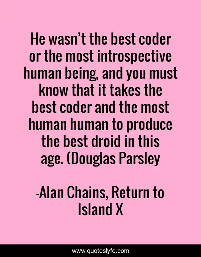 This page presents the quote "He wasn’t the best coder or the most introspective human being, and you must know that it takes the best coder and the most human human to produce the best droid in this age. (Douglas Parsley". Author of this quote is Alan Chains, Return to Island X. This quote is about machine, humanism, humanoid,.