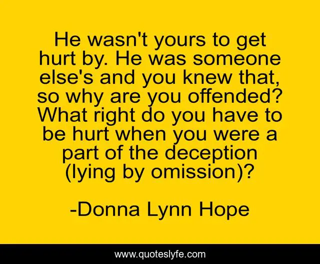 This page presents the quote "He wasn't yours to get hurt by. He was someone else's and you knew that, so why are you offended? What right do you have to be hurt when you were a part of the deception (lying by omission)?". Author of this quote is Donna Lynn Hope. This quote is about affair, cheating, deception, affairs, cheaters, homewrecker,.