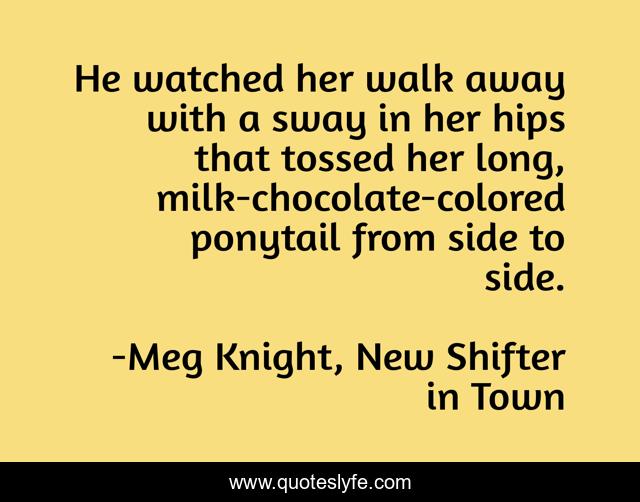 This page presents the quote "He watched her walk away with a sway in her hips that tossed her long, milk-chocolate-colored ponytail from side to side.". Author of this quote is Meg Knight, New Shifter in Town. This quote is about mystery-suspense-books, police, paranormal-romance,.