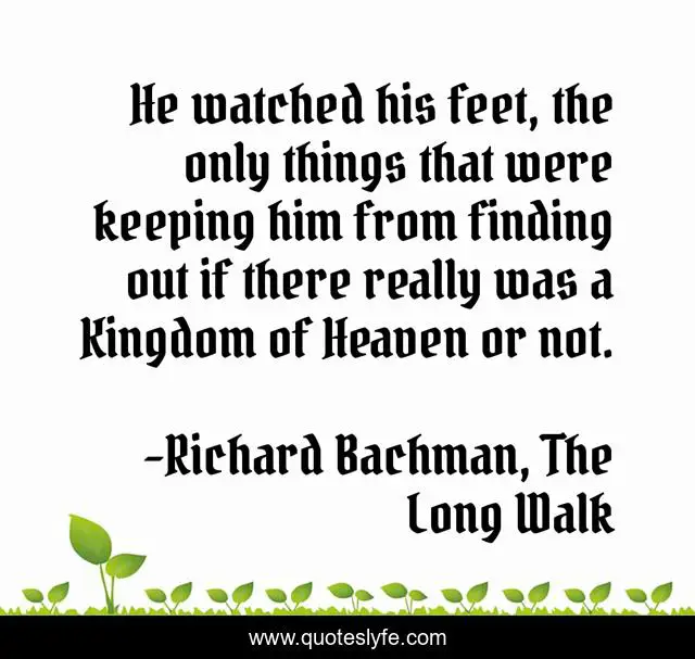 This page presents the quote "He watched his feet, the only things that were keeping him from finding out if there really was a Kingdom of Heaven or not.". Author of this quote is Richard Bachman, The Long Walk. This quote is about death, pain,.