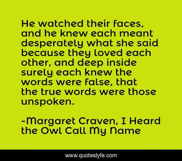 This page presents the quote "He watched their faces, and he knew each meant desperately what she said because they loved each other, and deep inside surely each knew the words were false, that the true words were those unspoken.". Author of this quote is Margaret Craven, I Heard the Owl Call My Name. .