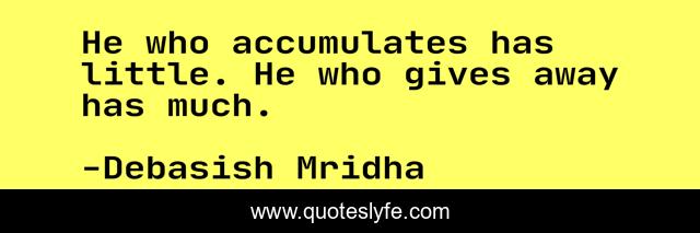 This page presents the quote "He who accumulates has little. He who gives away has much.". Author of this quote is Debasish Mridha. This quote is about he-who-accumalets-has-little, generosity, philosophy, debasish-mridha, quotes, giving-away, inspirational, enthusiasm, debasish-mridha-m-d,.