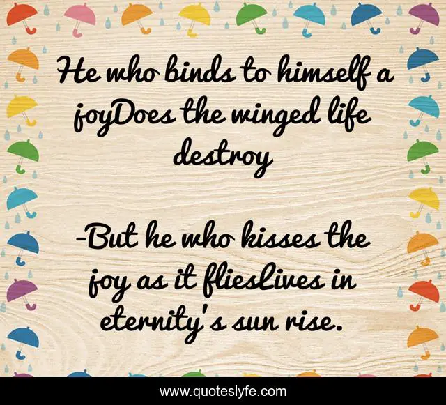 "But he who kisses the joy as it fliesLives in eternity's sun rise. Quotes." Quoteslyfe.com, 2025. Sun. 07 Dec. 2025. <https://www.quoteslyfe.com/quote/He-who-binds-to-himself-a-joyDoes-12615>.