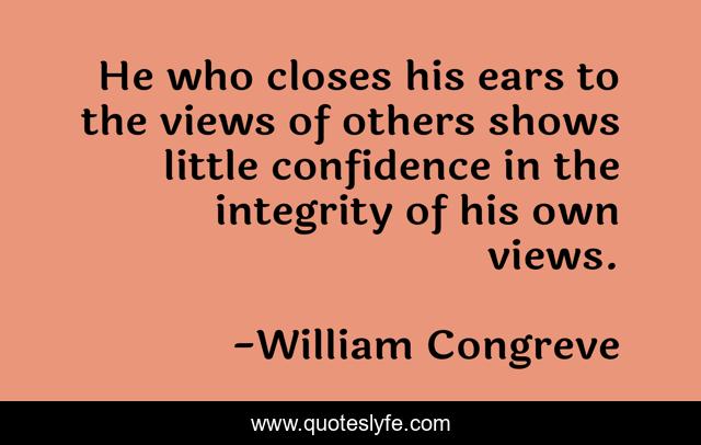 This page presents the quote "He who closes his ears to the views of others shows little confidence in the integrity of his own views.". Author of this quote is William Congreve. This quote is about confidence, integrity,.