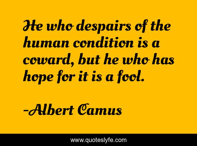 This page presents the quote "He who despairs of the human condition is a coward, but he who has hope for it is a fool.". Author of this quote is Albert Camus. .
