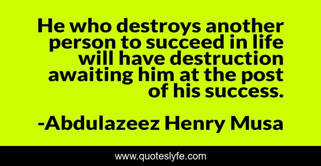 This page presents the quote "He who destroys another person to succeed in life will have destruction awaiting him at the post of his success.". Author of this quote is Abdulazeez Henry Musa. .