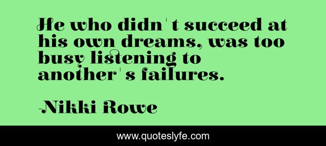 This page presents the quote "He who didn't succeed at his own dreams, was too busy listening to another's failures.". Author of this quote is Nikki Rowe. This quote is about success, surroundings, growth, life-lessons, dreams, inspiration,.