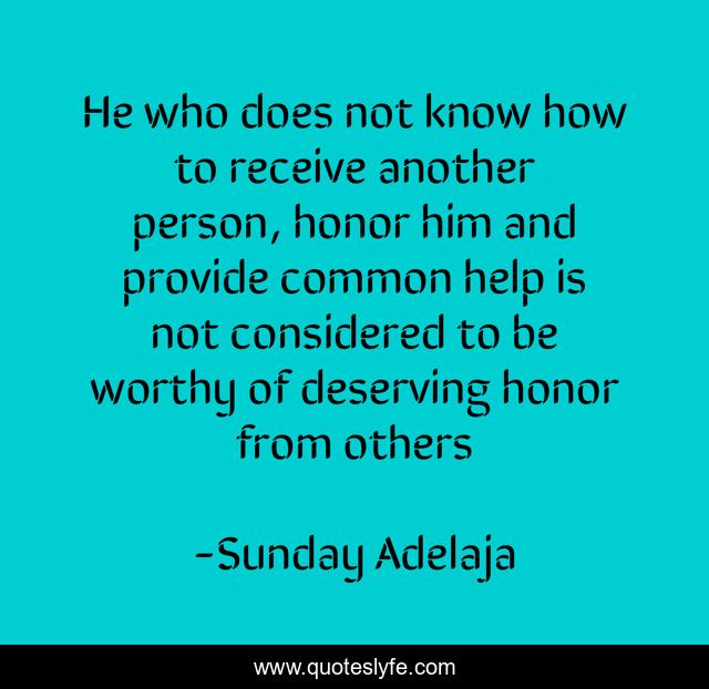 This page presents the quote "He who does not know how to receive another person, honor him and provide common help is not considered to be worthy of deserving honor from others". Author of this quote is Sunday Adelaja. This quote is about person, provide, honor, considered, worthy, receive,.