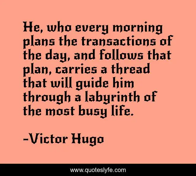 This page presents the quote "He, who every morning plans the transactions of the day, and follows that plan, carries a thread that will guide him through a labyrinth of the most busy life.". Author of this quote is Victor Hugo. This quote is about life, busy, day,.