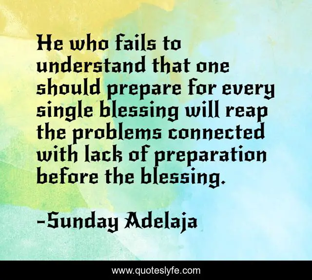 This page presents the quote "He who fails to understand that one should prepare for every single blessing will reap the problems connected with lack of preparation before the blessing.". Author of this quote is Sunday Adelaja. This quote is about preparation, reap, fails, understand, single,.