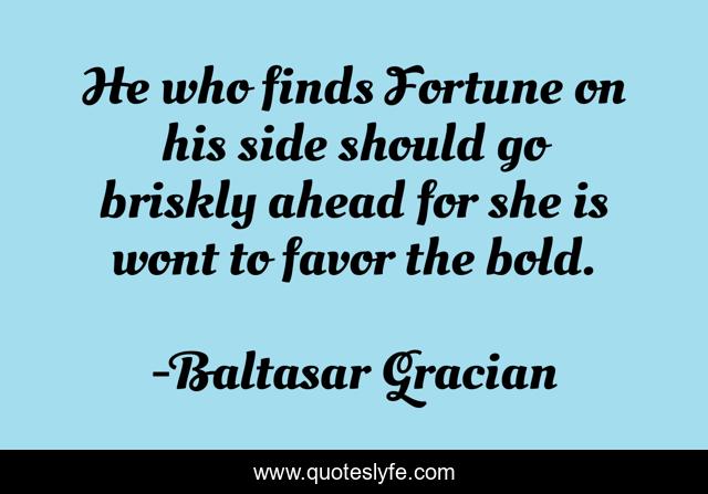 This page presents the quote "He who finds Fortune on his side should go briskly ahead for she is wont to favor the bold.". Author of this quote is Baltasar Gracian. .
