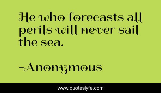 This page presents the quote "He who forecasts all perils will never sail the sea.". Author of this quote is Anonymous. This quote is about uncertainties, doubts,.
