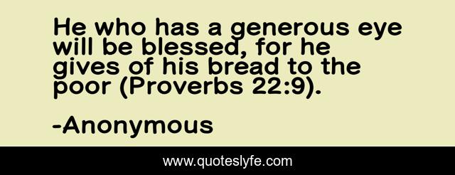 This page presents the quote "He who has a generous eye will be blessed, for he gives of his bread to the poor (Proverbs 22:9).". Author of this quote is Anonymous. This quote is about proverbs, generous, bible, scripture, blessed,.