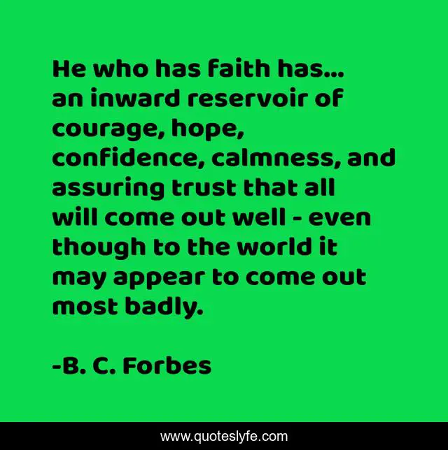 This page presents the quote "He who has faith has... an inward reservoir of courage, hope, confidence, calmness, and assuring trust that all will come out well - even though to the world it may appear to come out most badly.". Author of this quote is B. C. Forbes. This quote is about faith, courage, trust,.