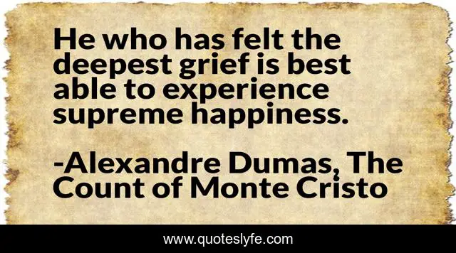 This page presents the quote "He who has felt the deepest grief is best able to experience supreme happiness.". Author of this quote is Alexandre Dumas, The Count of Monte Cristo. This quote is about sadness, happiness,.