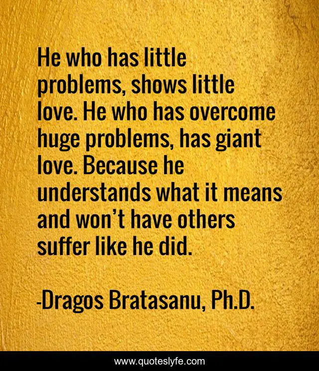 This page presents the quote "He who has little problems, shows little love. He who has overcome huge problems, has giant love. Because he understands what it means and won’t have others suffer like he did.". Author of this quote is Dragos Bratasanu, Ph.D.. This quote is about life, empathy, love, understanding-others, problems, wisdom, helping-others, kindness, friendship,.