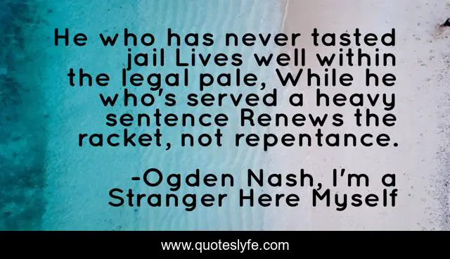 This page presents the quote "He who has never tasted jail Lives well within the legal pale, While he who's served a heavy sentence Renews the racket, not repentance.". Author of this quote is Ogden Nash, I'm a Stranger Here Myself. This quote is about crime, repentance, jail, experience-to-let, prison,.