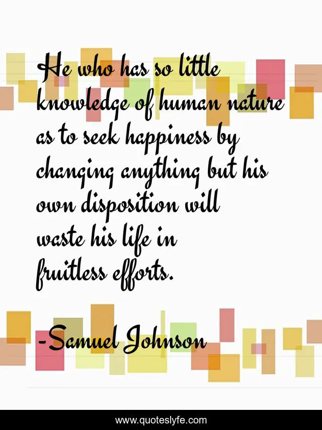This page presents the quote "He who has so little knowledge of human nature as to seek happiness by changing anything but his own disposition will waste his life in fruitless efforts.". Author of this quote is Samuel Johnson. This quote is about life, knowledge, happiness,.