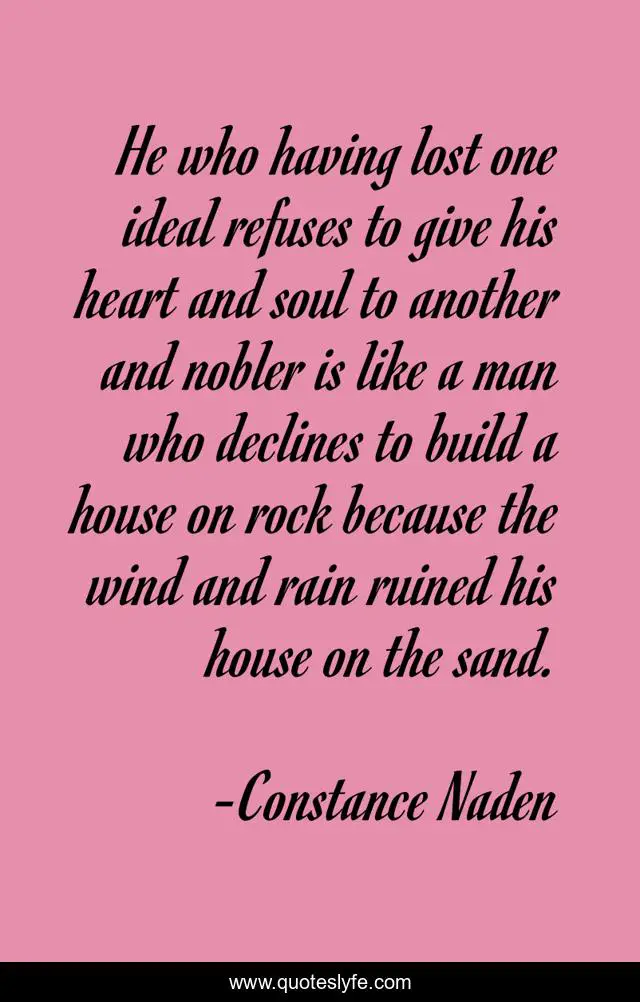 This page presents the quote "He who having lost one ideal refuses to give his heart and soul to another and nobler is like a man who declines to build a house on rock because the wind and rain ruined his house on the sand.". Author of this quote is Constance Naden. .