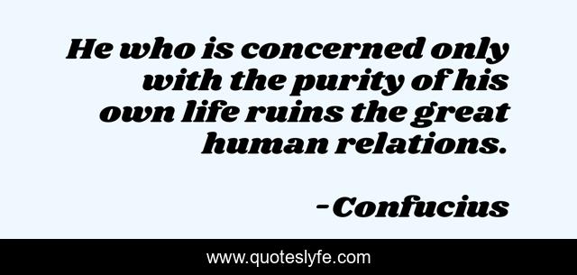 This page presents the quote "He who is concerned only with the purity of his own life ruins the great human relations.". Author of this quote is Confucius. This quote is about enthusiasm, philosophical, inspirational,.