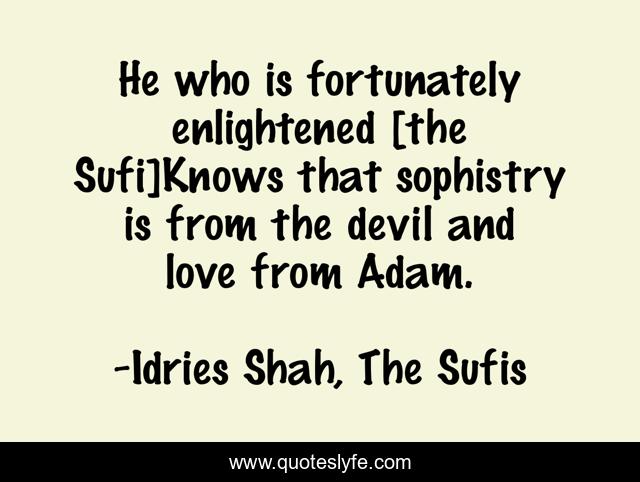 This page presents the quote "He who is fortunately enlightened [the Sufi]Knows that sophistry is from the devil and love from Adam.". Author of this quote is Idries Shah, The Sufis. This quote is about sufism, sufi-wisdom, sufis, wisdom,.