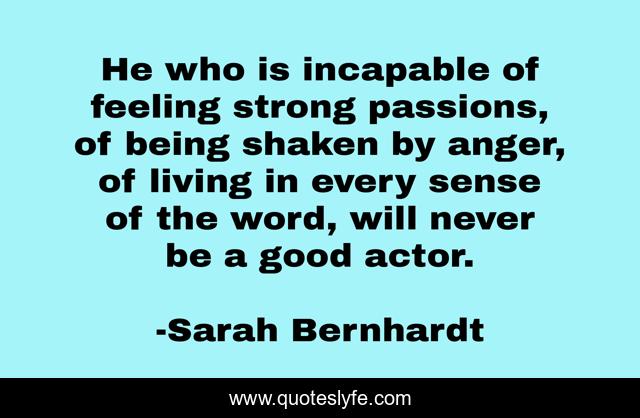 This page presents the quote "He who is incapable of feeling strong passions, of being shaken by anger, of living in every sense of the word, will never be a good actor.". Author of this quote is Sarah Bernhardt. This quote is about living, good, strong,.