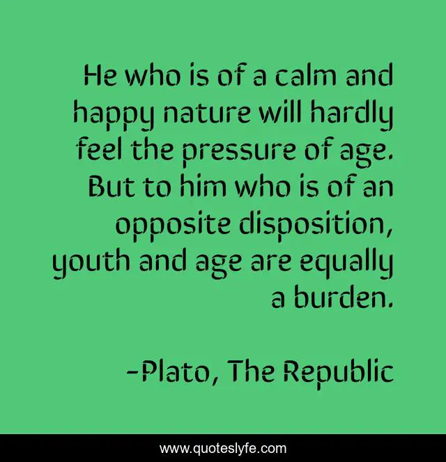 This page presents the quote "He who is of a calm and happy nature will hardly feel the pressure of age. But to him who is of an opposite disposition, youth and age are equally a burden.". Author of this quote is Plato, The Republic. This quote is about maturation, character, contentment,.