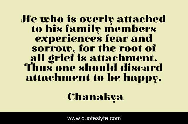 This page presents the quote "He who is overly attached to his family members experiences fear and sorrow, for the root of all grief is attachment. Thus one should discard attachment to be happy.". Author of this quote is Chanakya. This quote is about grief, fear, happy,.