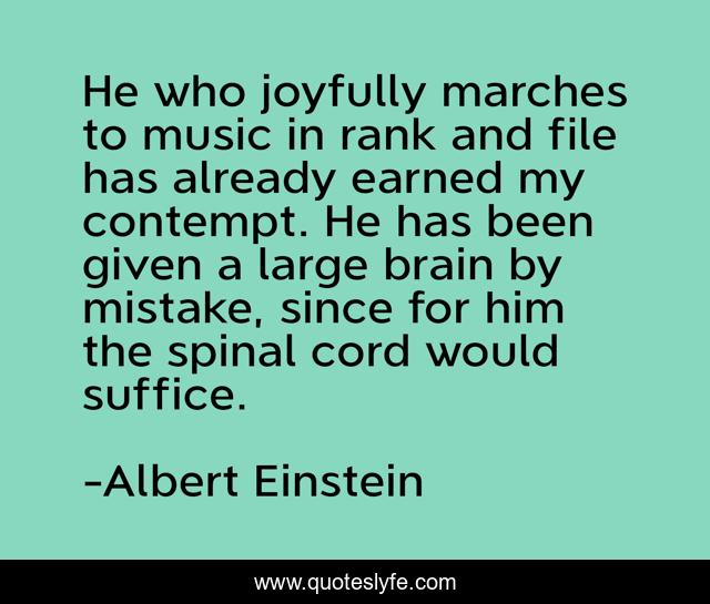 This page presents the quote "He who joyfully marches to music in rank and file has already earned my contempt. He has been given a large brain by mistake, since for him the spinal cord would suffice.". Author of this quote is Albert Einstein. This quote is about intelligence, brain, mistake,.